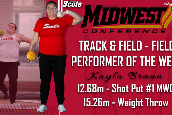 Monmouth College senior thrower Kayla Braun (Evansville, Illinois) was named Midwest Conference Field Performer of the Week for the first week of the track and field indoor season. At Saturday's Frigid Bee Opener, hosted by St. Ambrose, Braun took se...
