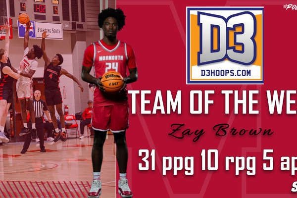 Monmouth College men's basketball player Zay Brown (Peoria, Illinois) was named to the 5-man D3hoops.com Team of the Week on Tuesday. Brown, a sophomore. is Monmouth's first selection to the D3hoops.com Team of the Week since Will Carius made the team ...